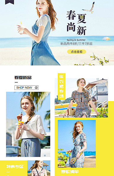 [B1914] 蓝黄色系简约文艺风格-女装行业手淘首页模板